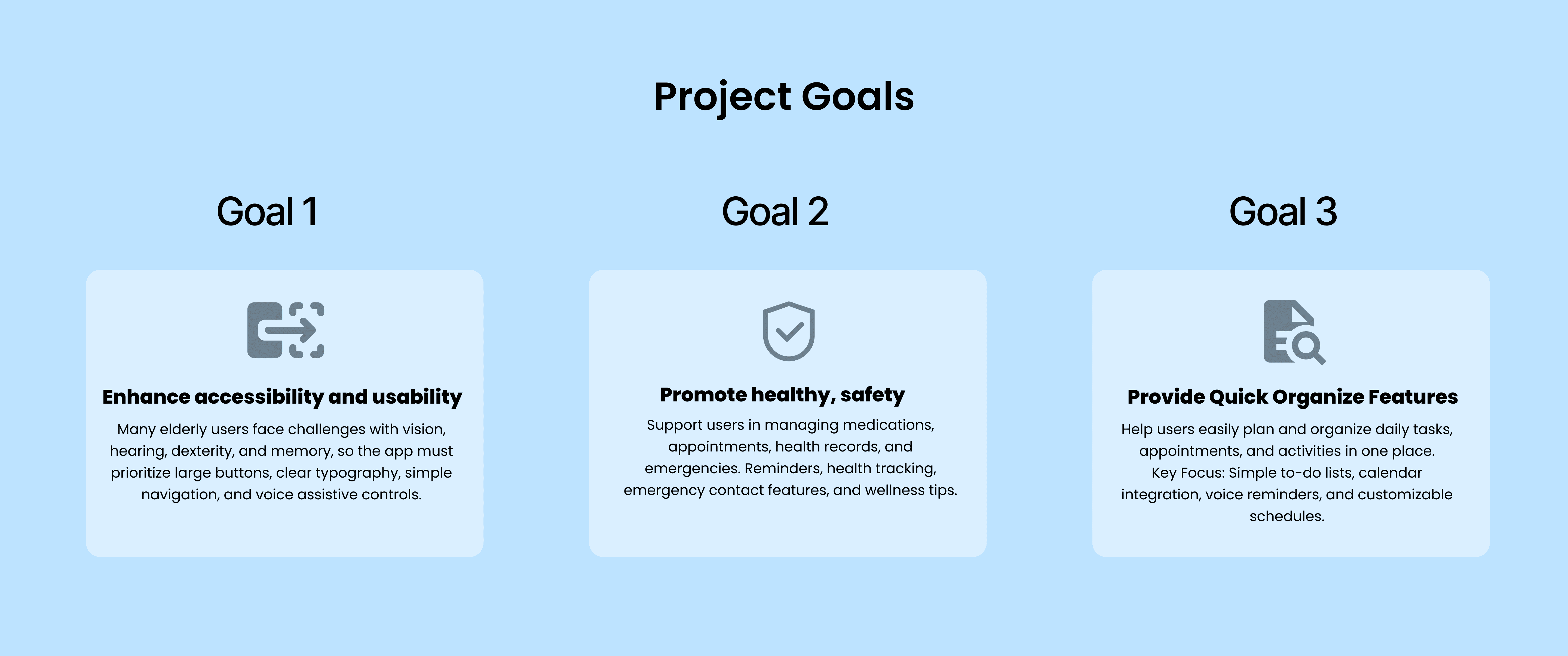 Many elderly individuals struggle with managing medications, staying connected with loved ones, and using modern technology due to accessibility challenges. Existing health apps often have cluttered interfaces and fail to address their specific needs.